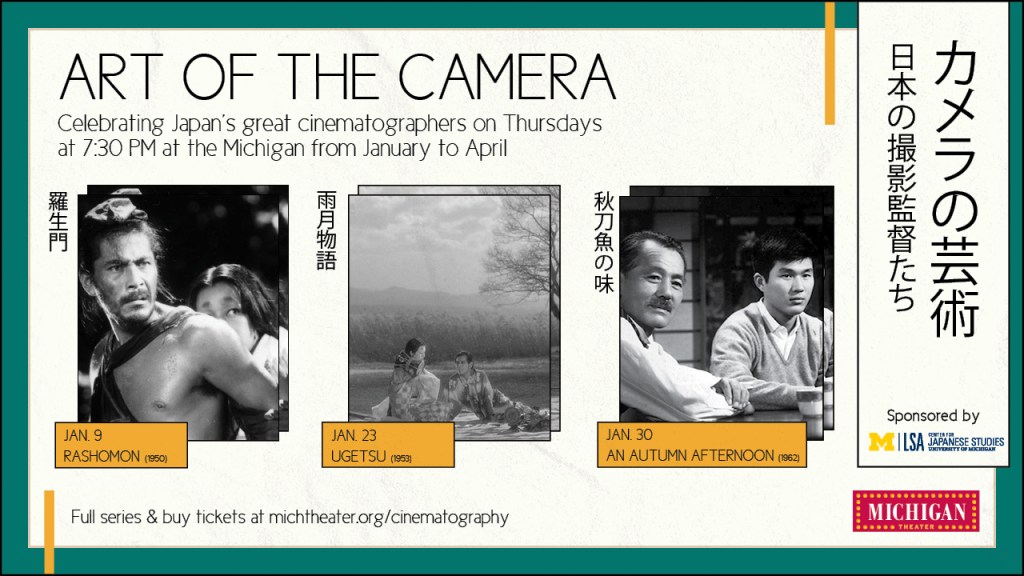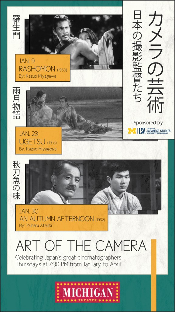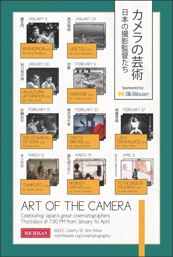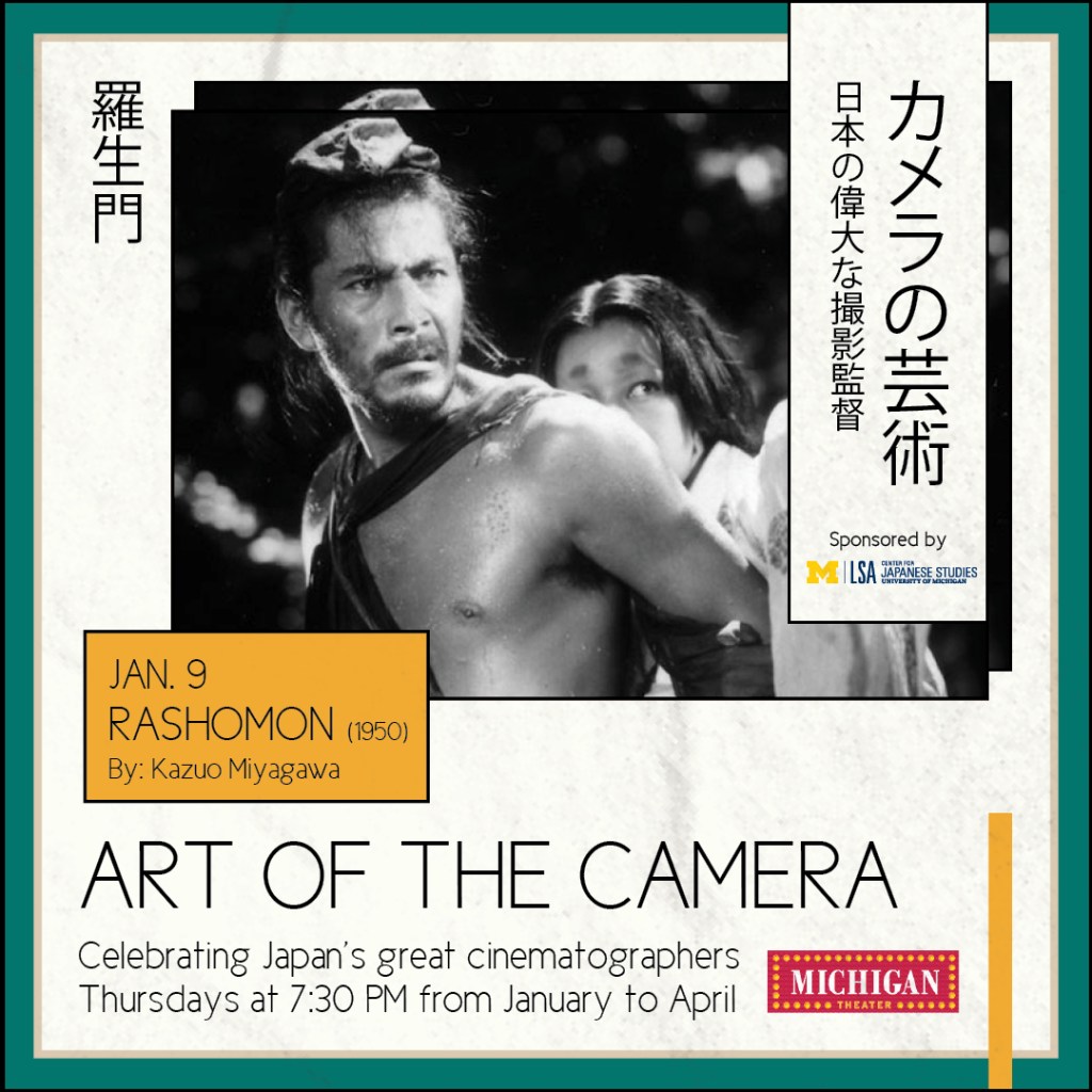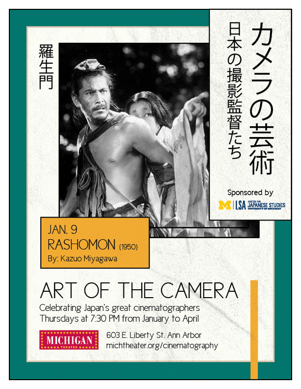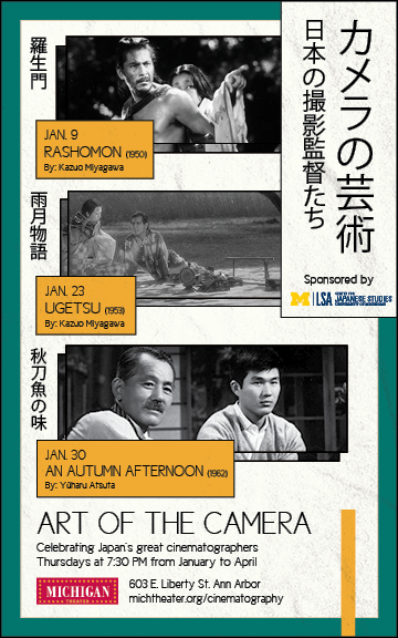 These marketing materials were designed for the Michigan Theater’s Art of the Camera film series. This was a series that celebrated Japan’s great cinematographers. For this design, I wanted to incorporate the Japanese language for the title, as well as the for the films that were playing. I looked at various Japanese flyers and graphic design pieces that inspired the type layout, as well as other visual elements.