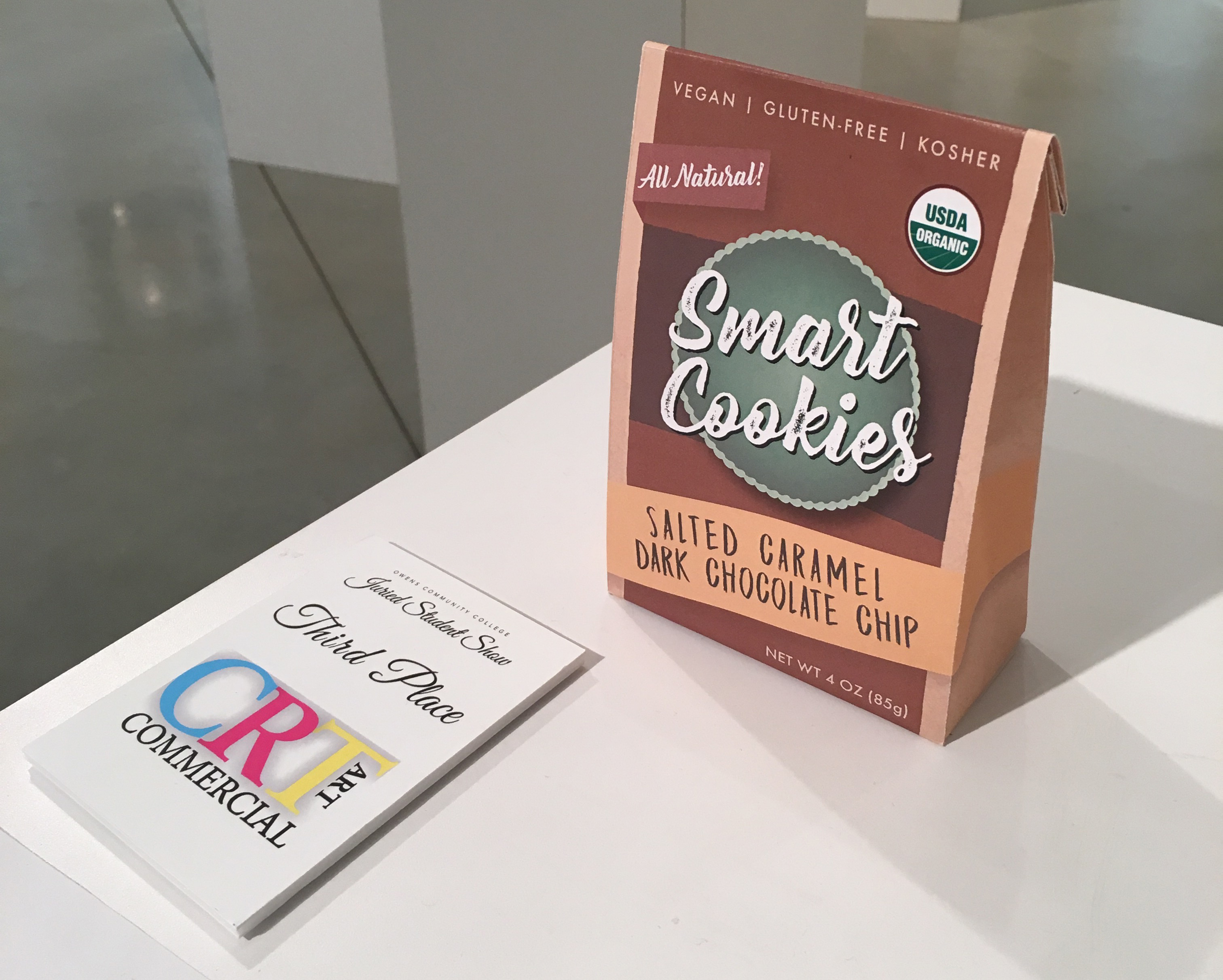 For my Package Design course at Owens Community College, we were given the task to create a box template and design that displays and enhances a product. I decided to develop a fictitious cookie brand called “Smart Cookies” and create a bag style package for a potential product.